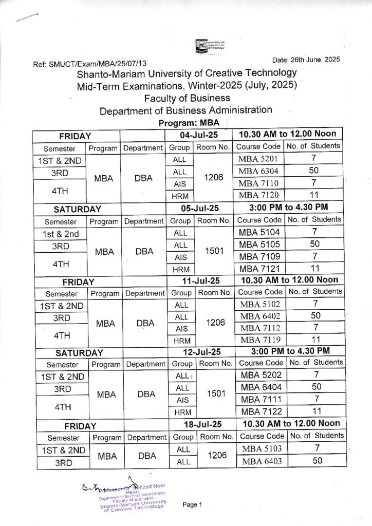 MBA Mid-Term Examination Routine for Winter-2025