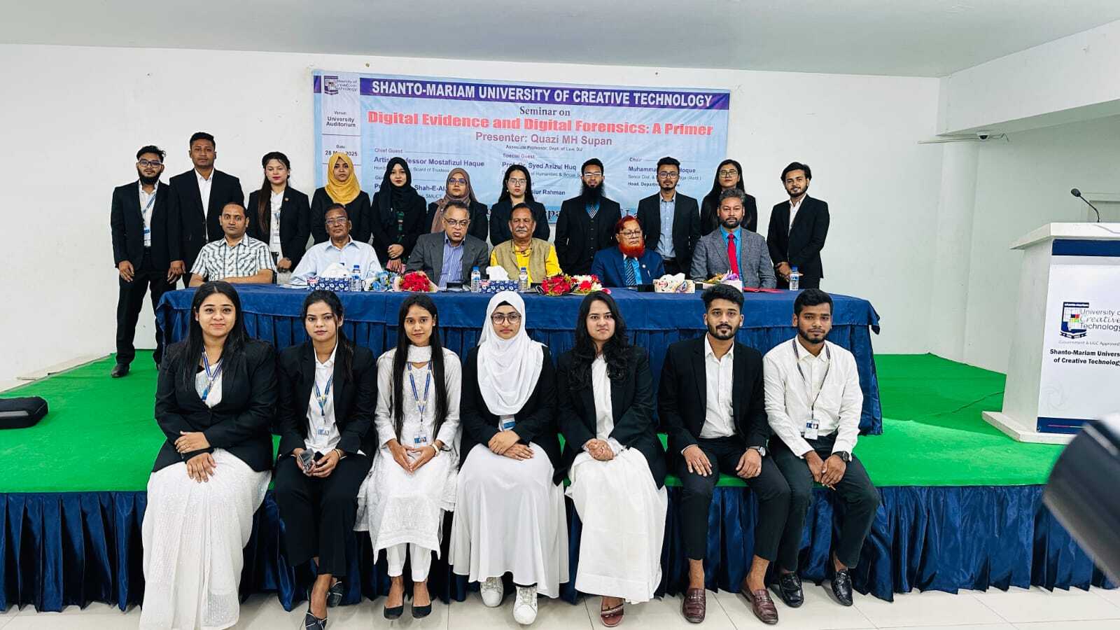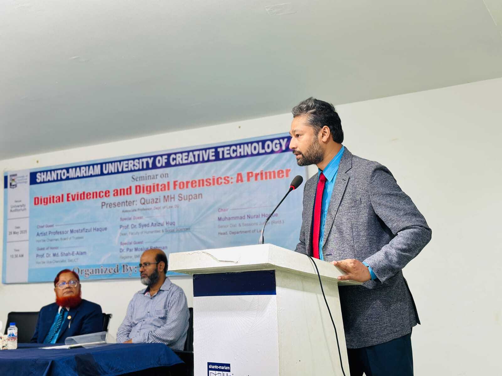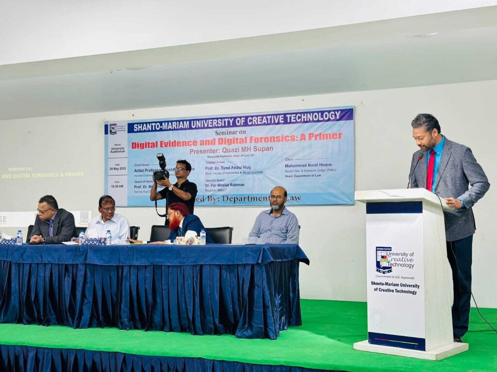 রাজধানীর উত্তরায় অবস্থিত শান্ত-মারিয়াম ইউনিভার্সিটি অব ক্রিয়েটিভ টেকনোলজি (এসএমইউসিটি)-এর আইন বিভাগ ‘ডিজিটাল এভিডেন্স এন্ড ডিজিটাল ফরেনসিক্সঃ অ্যা প্রাইমার’ শীর্ষক একটি সেমিনারের আয়োজন করেছে। গত ২৮ই মে ২০২৫ তারিখ সকাল ১০:৩০ টায় বিশ্ববিদ্যালয়ের অডিটোরিয়ামে আরম্ভ হওয়া সেমিনারটিতে প্রধান অতিথির আসন অলংকৃত করেন বিশ্ববিদ্যালয়ের বোর্ড অব ট্রাস্টিজের সম্মানিত চেয়ারম্যান, শিল্পী অধ্যাপক মোস্তাফিজুল হক। উক্ত সেমিনারে ‘গেস্ট অব অনার’ হিসেবে উপস্থিত ছিলেন বিশ্ববিদ্যালয়ের উপাচার্য অধ্যাপক ড. মোঃ শাহ-ই-আলম। এছাড়া বিশেষ অতিথি হিসেবে উপস্থিত ছিলেন মানবিক ও সামাজিক বিজ্ঞান অনুষদের ডিন অধ্যাপক ড. সৈয়দ আজিজুল হক এবং বিশ্ববিদ্যালয়ের রেজিস্ট্রার ড. পাড় মঁশিয়ূর রহমান। সেমিনারের সভাপতিত্ব করেন সিনিয়র জেলা ও দায়রা জজ (অবঃ) এবং এসএমইউসিটি আইন বিভাগের প্রধান মোহাম্মদ নূরল হক। সেমিনারটি সঞ্চালনা করেন এসএমইউসিটি এর আইন বিভাগের সহকারি অধ্যাপক ও কো-অর্ডিনেটর মোঃ রিয়াদ হাসান। সেমিনারটিতে মূল আলোচনা উপস্থাপনা করেন ঢাকা বিশ্ববিদ্যালয়ের আইন বিভাগের সহযোগী অধ্যাপক কাজী মাহফুজুল হক সুপণ।