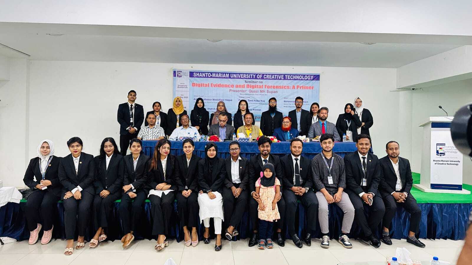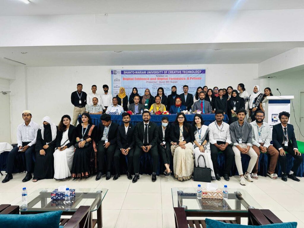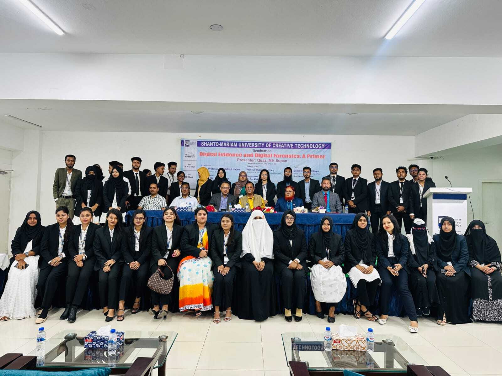 রাজধানীর উত্তরায় অবস্থিত শান্ত-মারিয়াম ইউনিভার্সিটি অব ক্রিয়েটিভ টেকনোলজি (এসএমইউসিটি)-এর আইন বিভাগ ‘ডিজিটাল এভিডেন্স এন্ড ডিজিটাল ফরেনসিক্সঃ অ্যা প্রাইমার’ শীর্ষক একটি সেমিনারের আয়োজন করেছে। গত ২৮ই মে ২০২৫ তারিখ সকাল ১০:৩০ টায় বিশ্ববিদ্যালয়ের অডিটোরিয়ামে আরম্ভ হওয়া সেমিনারটিতে প্রধান অতিথির আসন অলংকৃত করেন বিশ্ববিদ্যালয়ের বোর্ড অব ট্রাস্টিজের সম্মানিত চেয়ারম্যান, শিল্পী অধ্যাপক মোস্তাফিজুল হক। উক্ত সেমিনারে ‘গেস্ট অব অনার’ হিসেবে উপস্থিত ছিলেন বিশ্ববিদ্যালয়ের উপাচার্য অধ্যাপক ড. মোঃ শাহ-ই-আলম। এছাড়া বিশেষ অতিথি হিসেবে উপস্থিত ছিলেন মানবিক ও সামাজিক বিজ্ঞান অনুষদের ডিন অধ্যাপক ড. সৈয়দ আজিজুল হক এবং বিশ্ববিদ্যালয়ের রেজিস্ট্রার ড. পাড় মঁশিয়ূর রহমান। সেমিনারের সভাপতিত্ব করেন সিনিয়র জেলা ও দায়রা জজ (অবঃ) এবং এসএমইউসিটি আইন বিভাগের প্রধান মোহাম্মদ নূরল হক। সেমিনারটি সঞ্চালনা করেন এসএমইউসিটি এর আইন বিভাগের সহকারি অধ্যাপক ও কো-অর্ডিনেটর মোঃ রিয়াদ হাসান। সেমিনারটিতে মূল আলোচনা উপস্থাপনা করেন ঢাকা বিশ্ববিদ্যালয়ের আইন বিভাগের সহযোগী অধ্যাপক কাজী মাহফুজুল হক সুপণ।
